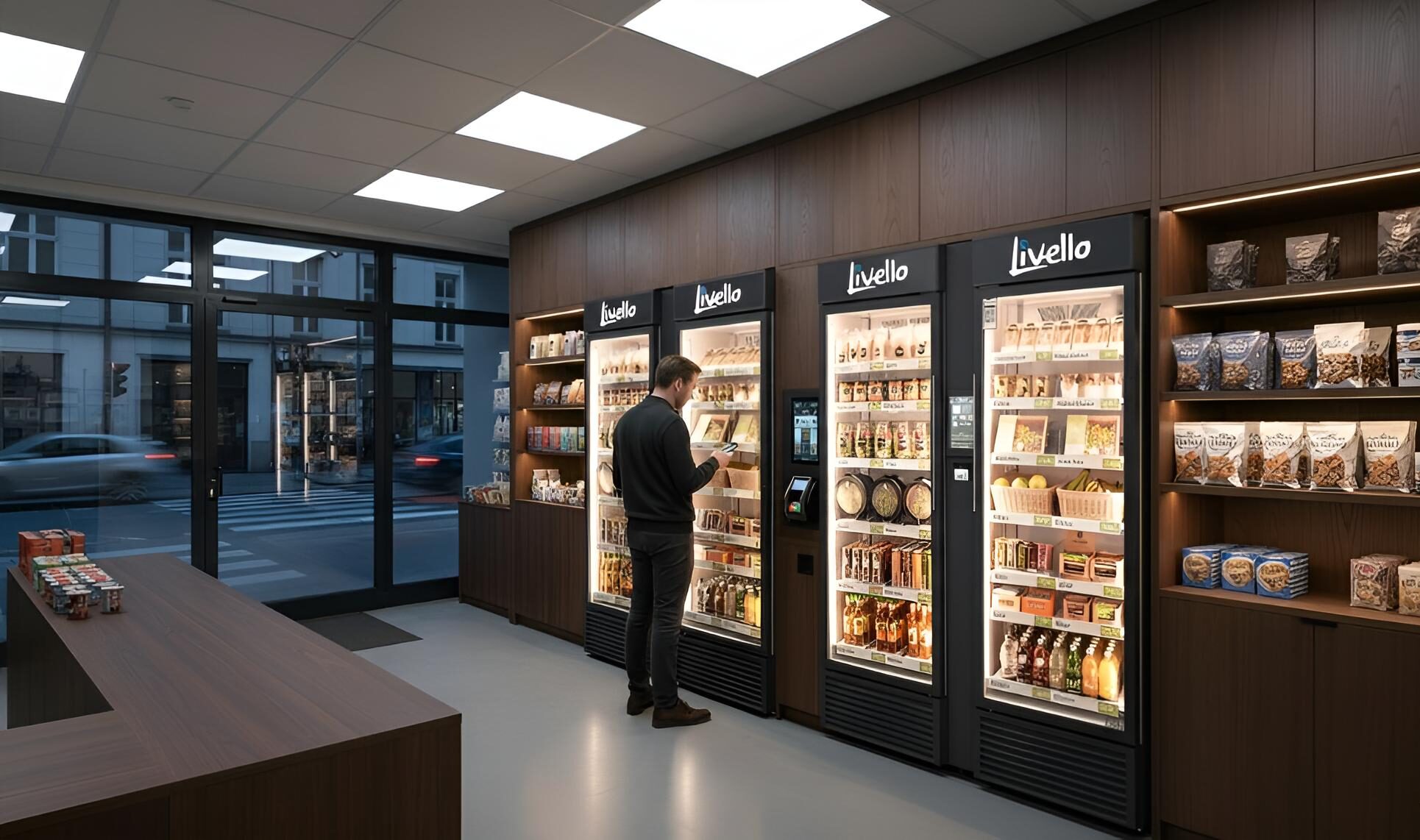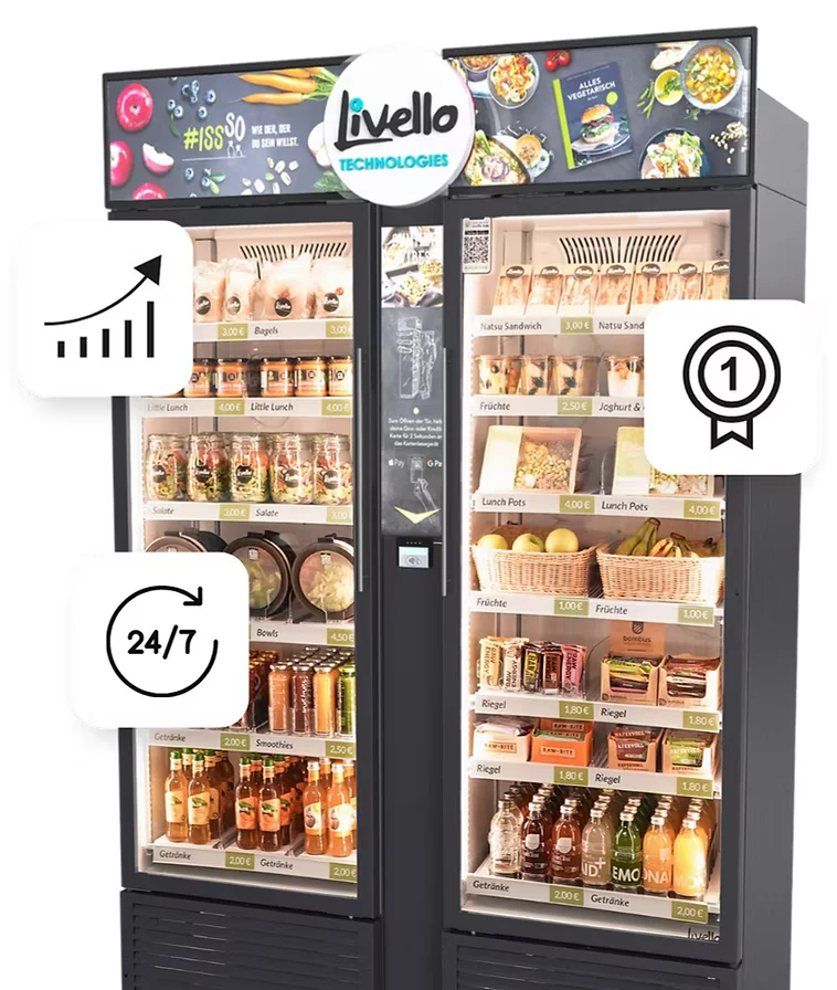 Steigern Sie Ihren Erfolg mit dem Smart-Fridge (intelligenten Kühlschrank) von Livello: Bieten Sie hochwertige Verpflegung an verschiedenen Standorten an und profitieren Sie von der einfachen Integration und den anpassbaren Lösungen.